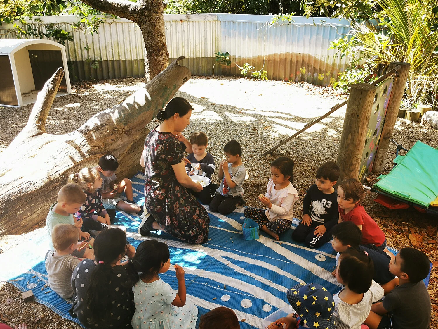 We encourage healthy waste-free lunches and support and encourage our parents with plenty of information and ideas. All children eat morning tea, lunch and afternoon fruit time together. This can be inside around tables, or outside on a mat under the tree or a picnic on the grass.